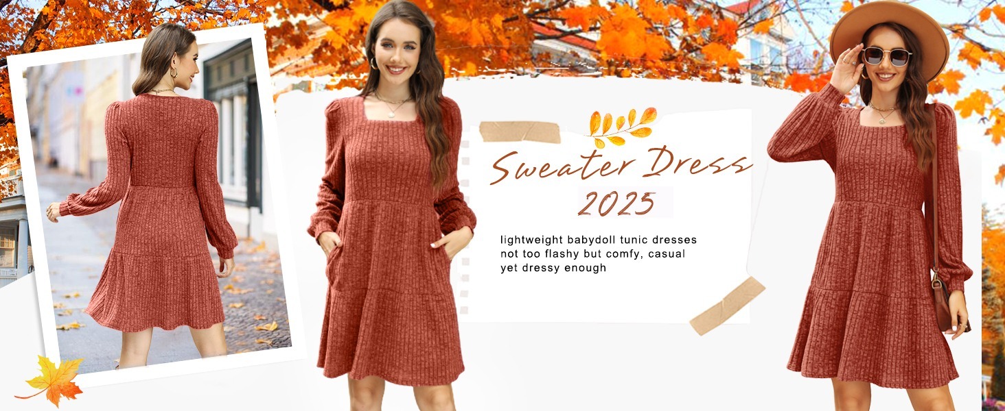 🔥Womens Square Neck Long Sleeve Fall Dresses Casual Babydoll Sweater Dress
